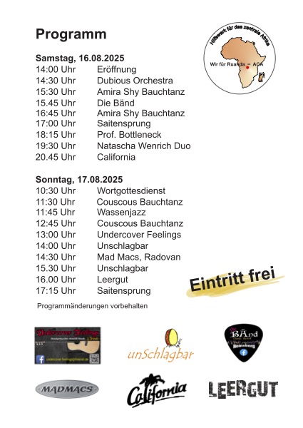 Besucher dürfen sich auf ein abwechslungsreiches Programm mit wunderbarer Livemusik regionaler Künstler und Bands sowie Tanzdarbietungen freuen. Alle Gruppen und Bands stellen sich ehrenamtlich in den Dienst der guten Sache. Den Auftakt machen, im Anschluss an die Eröffnung um 14:00 Uhr, am Samstag, 16. August 2025, ab 14:30 Uhr die Bands „Dubious Orchestra“, „Die Bänd“, „Saitensprung“, „Prof. Bottleneck“ sowie „Natascha Wenrich“ (die Stimme von Beets ´n Berries). Alle spielen jeweils rund eine Stunde. Während einer Umbaupause ist zudem ein Auftritt der Bauchtanzgruppe „Amira Shy“ vorgesehen. Den Abend krönt die Oberbrucher Band California, die gegen 20:45 Uhr mit Rock- und Pop-Klassikern der 80er und 90er Jahre für Partystimmung sorgt und bis ca. 23:00 Uhr auftritt. Für die Band wird dieser Abend etwas Besonderes, liegen die vielen Auftritte auf dem Afrikafest doch nun schon einige Jahre zurück. So war „California“ schon bei den ersten Benefizveranstaltungen des Vereins in den 90er Jahren dabei und immer ein Garant für tolle Partystimmung.